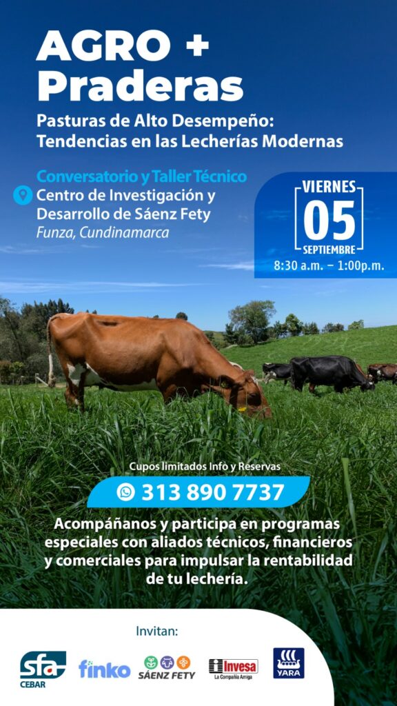 🚜🌾 Tendencias en pasturas de alto desempeño 🐄Este 5 de septiembre llega AGRO + Praderas a Funza, Cundinamarca 📍 🤝 Alianzas técnicas, financieras y comerciales💰 Soluciones para mejorar la rentabilidad de tu lechería 🕗 Hora: 8:30 a.m. – 1:00 p.m.📲 Reserva ya: 313 890 7737 (Cupos limitados) 🌟 ¡No te lo pierdas! Aprende, conecta y […]